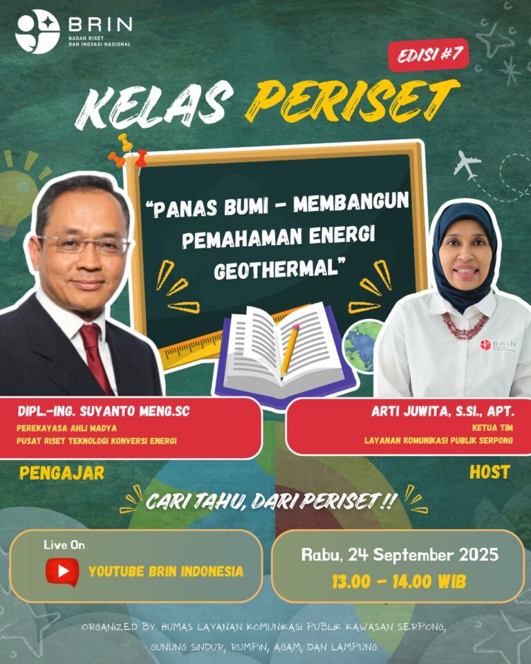 Tangerang Selatan – Humas BRIN. Indonesia memiliki potensi panas bumi sekitar 24 gigawatt, namun pemanfaatannya baru mencapai 2,5 gigawatt. Angka ini menempatkan Indonesia pada posisi kedua di dunia dari sisi cadangan, tetapi masih tertinggal dalam pemanfaatannya. Potensi besar ini menjadi peluang penting untuk mendukung transisi energi menuju masa depan yang ramah lingkungan, bersih, dan berkelanjutan….