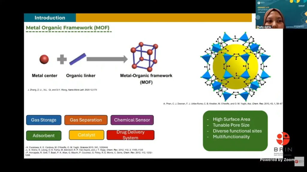 Tangerang Selatan – Humas BRIN. Riset Metal-Organic Frameworks (MOF) berkembang pesat dengan puluhan ribu jenis yang telah disintesis dari berbagai kombinasi logam dan ligan organik. Salah satu MOF yang banyak diteliti adalah ZIF-8, yang memiliki struktur berpori khas serta ukuran pori yang dapat diatur sesuai kebutuhan aplikasi. Peneliti Ahli Muda Pusat Riset Teknologi Polimer (PRTP) Badan…