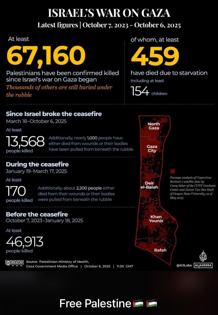 ➀ 67.160 warga Palestina telah dikonfirmasi meninggal sejak perang dimulai.